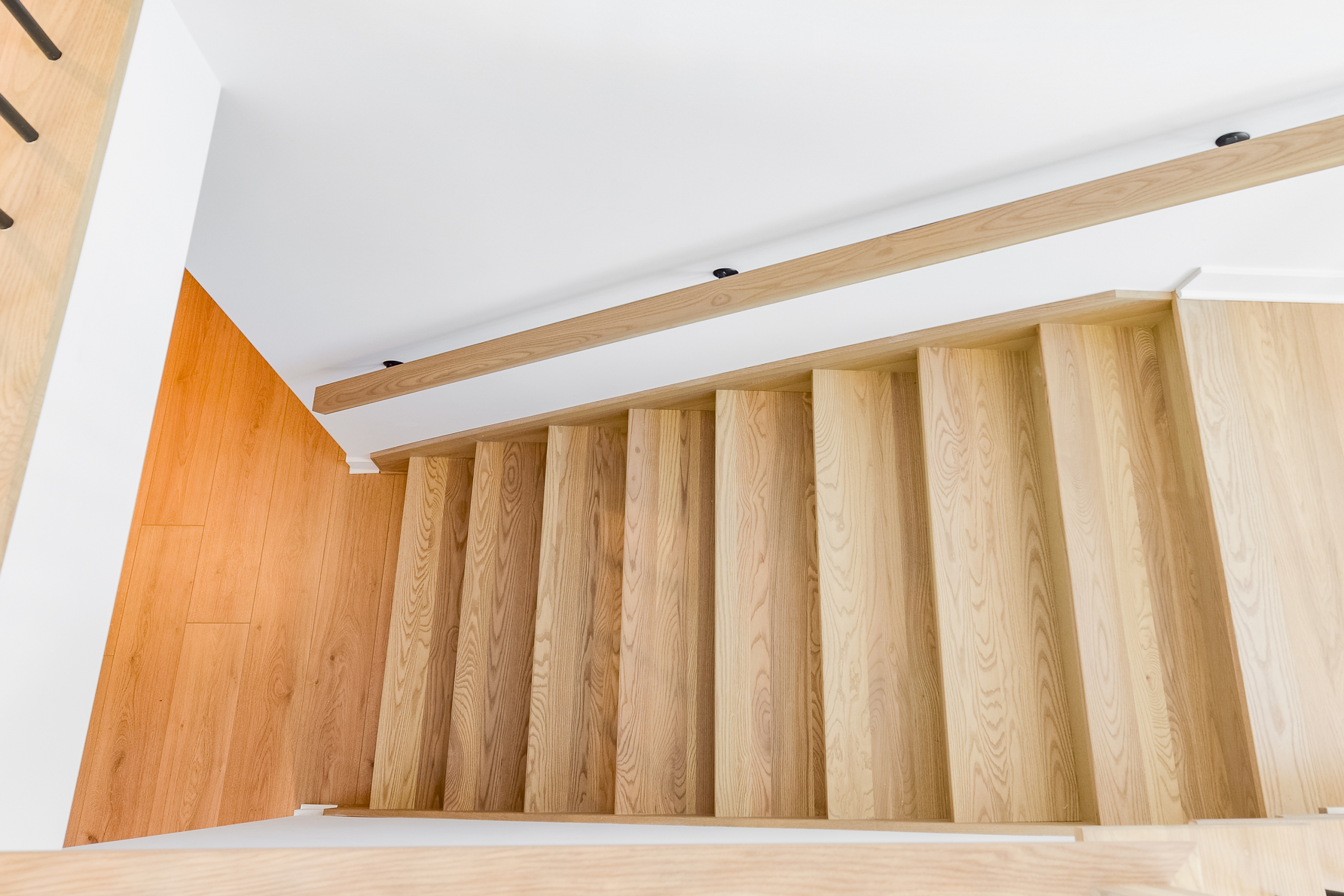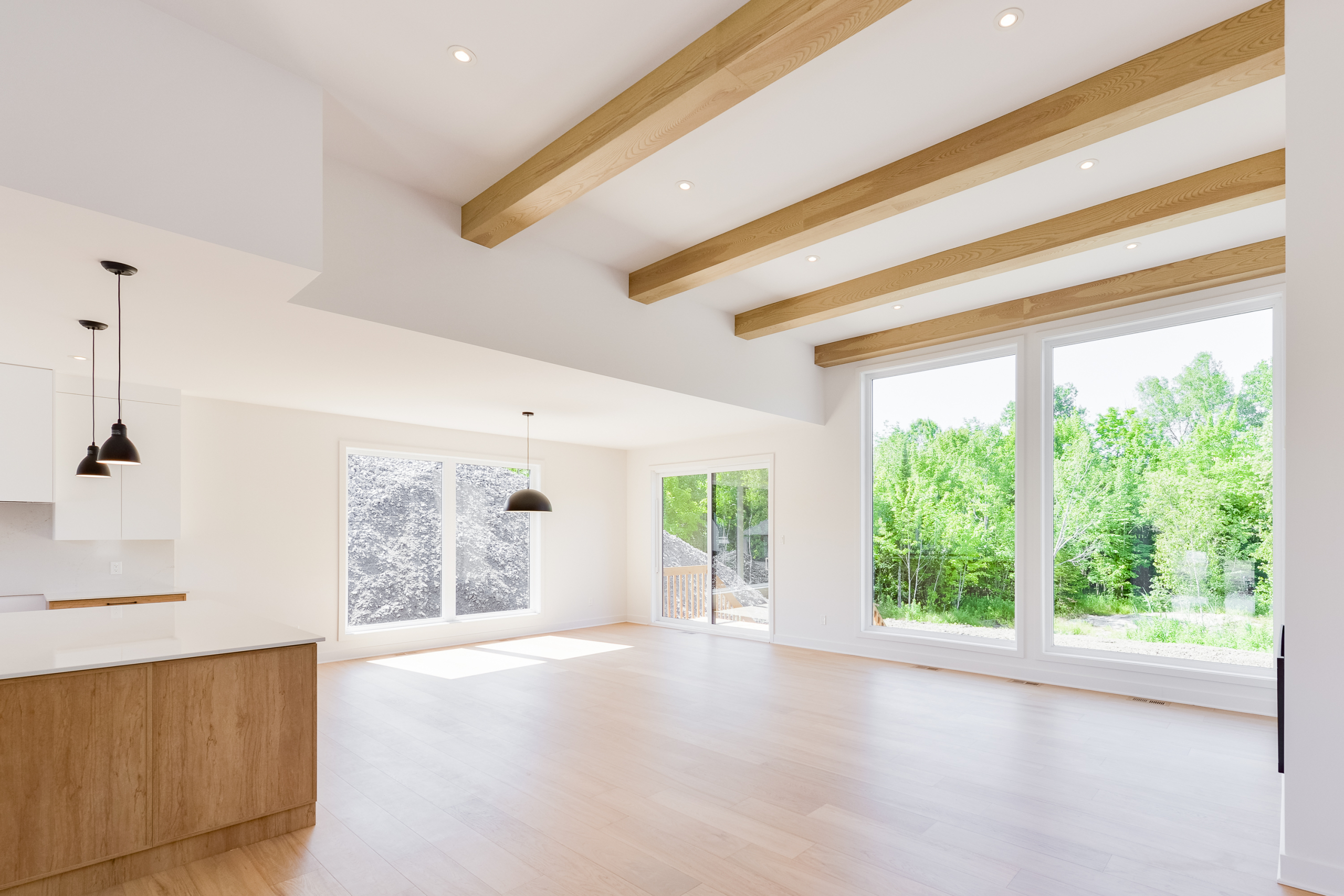 • False wood veneer beams and vaulted ceiling cladding in 7 ½ in white engineered oak